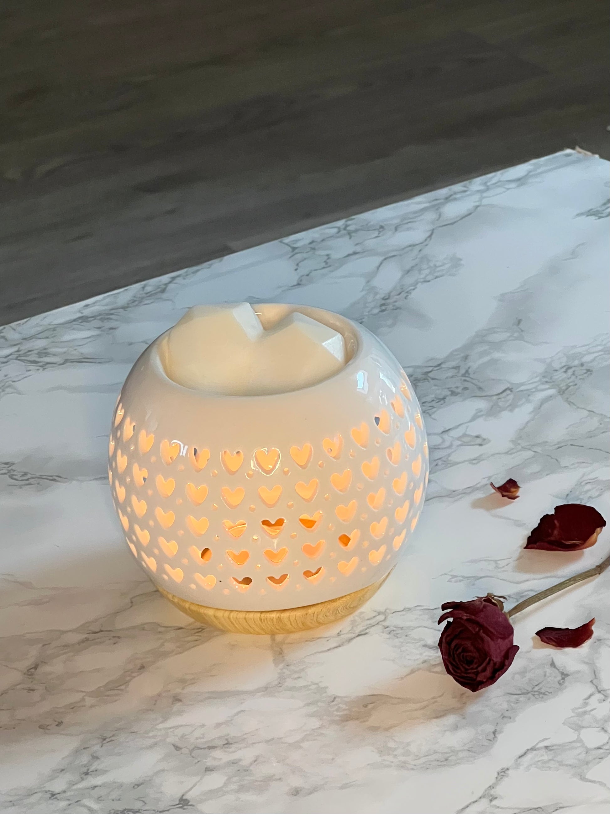 Un brûleur élégant orné de petits cœurs , une fois allumé, il dégage une odeur apaisante et crée une ambiance romantique dans votre pièce.