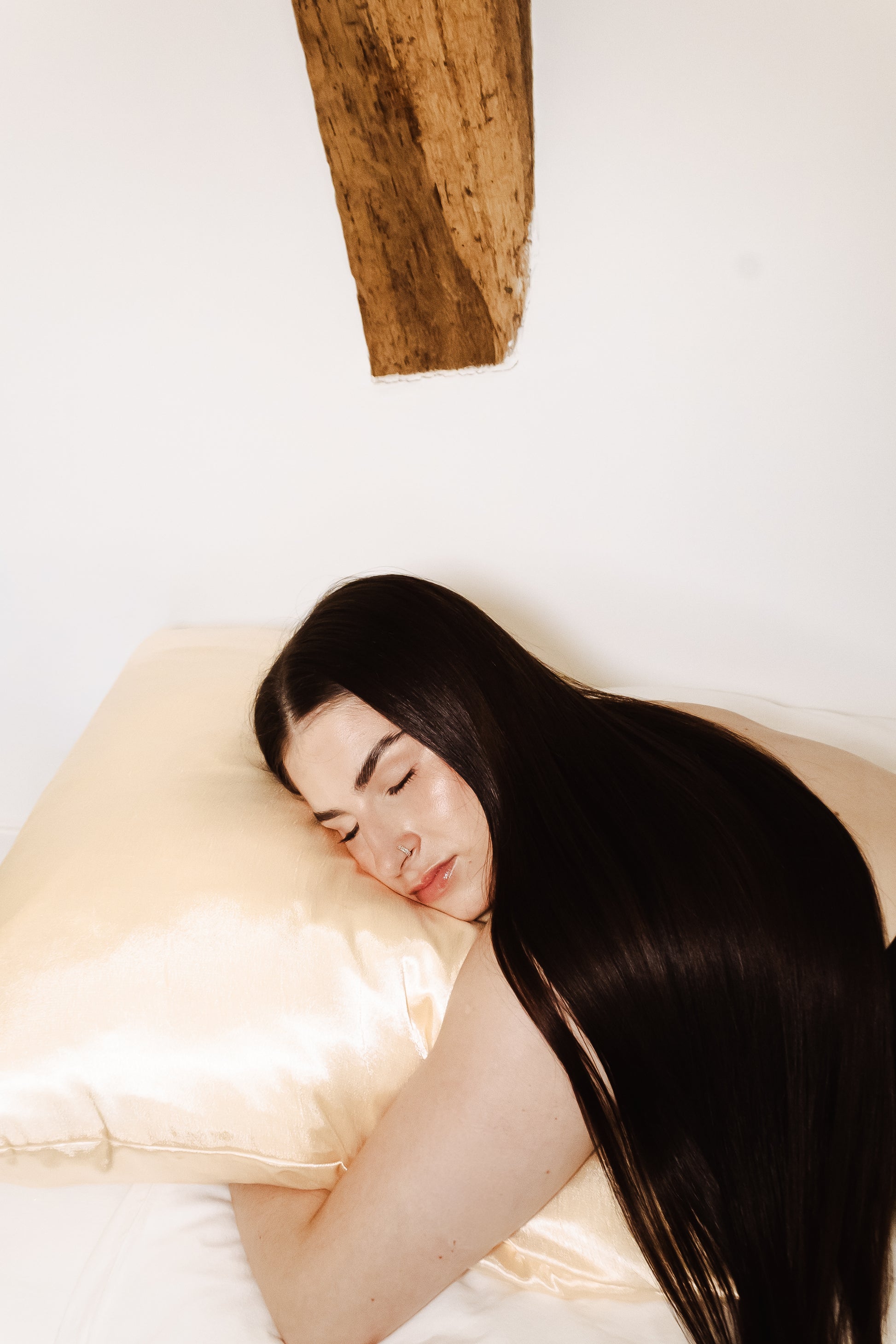 Taie d’oreiller en satin : limite les frottements pendant la nuit, réduit les frisottis et prévient les fourches pour des cheveux doux et brillants au réveil.