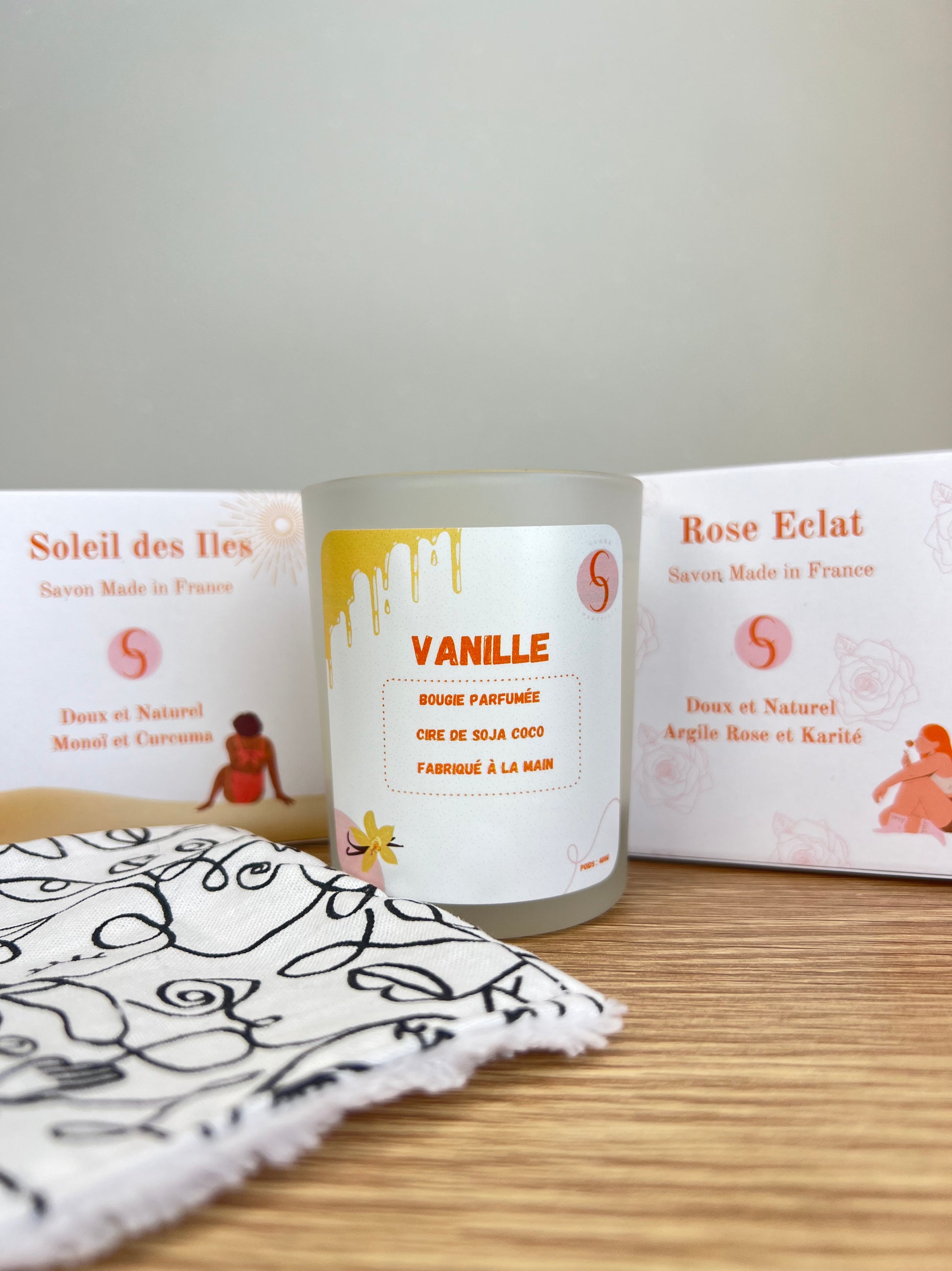 Une bougie parfumée à la Vanille, à combustion lente, fabriquée à base de cire végétale (coco et soja) sans paraffine.